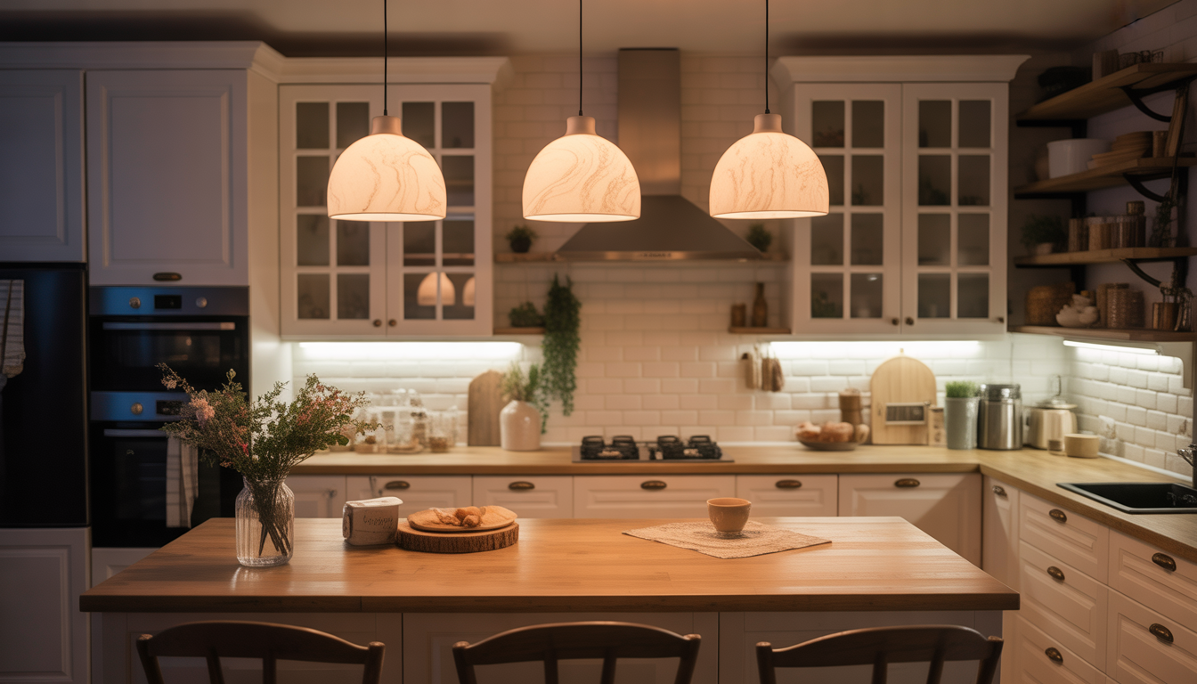L’éclairage fait toute la différence! Privilégiez des suspensions au-dessus du comptoir ou de l’îlot, et ajoutez des lumières LED sous les armoires. Un éclairage doux crée une ambiance accueillante et met en valeur vos plus belles pièces déco. D’après Hydro-Québec, l’éclairage LED réduit la consommation d’énergie de 75% par rapport aux ampoules classiques.