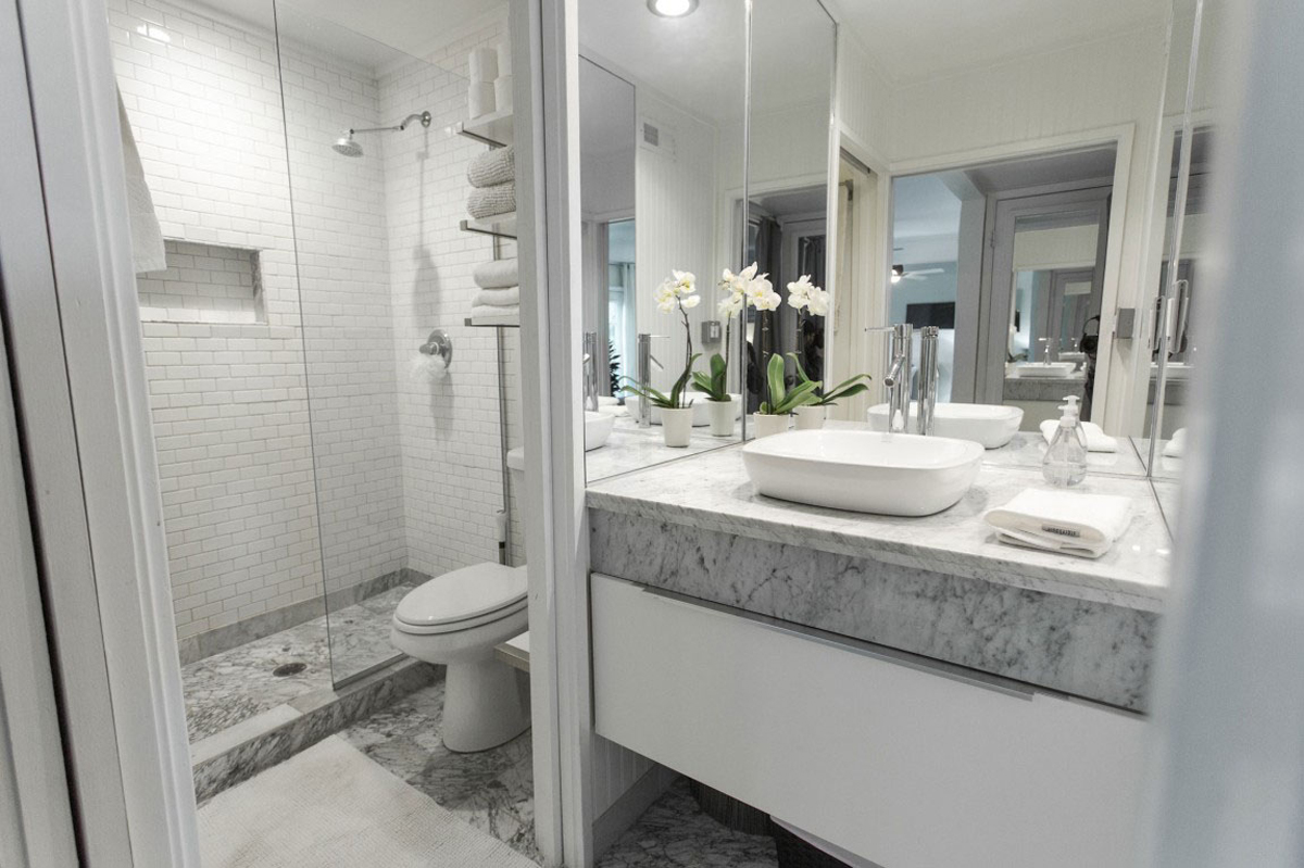 Cette salle de bain offre peu d’espace pour circuler, mais lorsqu’on constate l’immensité de la douche, on comprend mieux le choix des propriétaires d’avoir décidé de rénover ainsi.