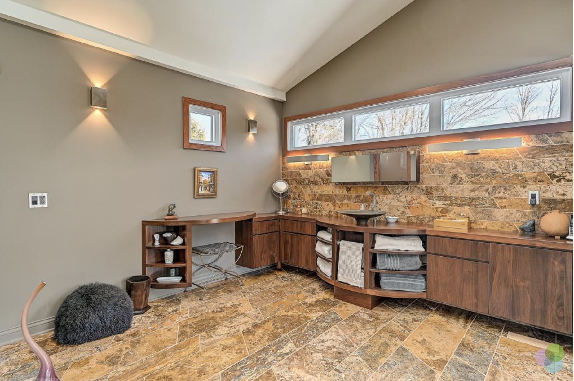 La salle de bain attenante possède également un très long comptoir, parfait pour se préparer le matin avant d’attaquer la journée!