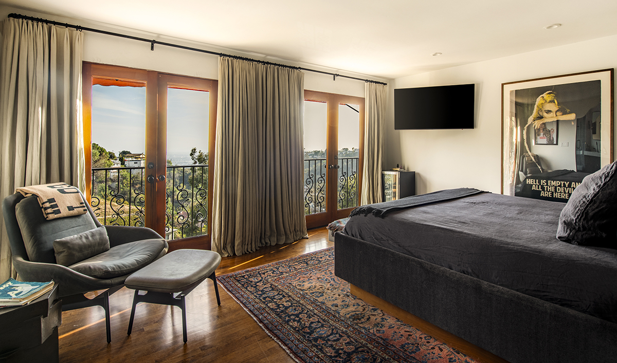 La chambre du rappeur est assez simple, lui qui a une vue incroyable sur Los Angeles, en direct de son lit! On souligne les nombreux cadres logés sur les murs, dont un dans la chambre principale.