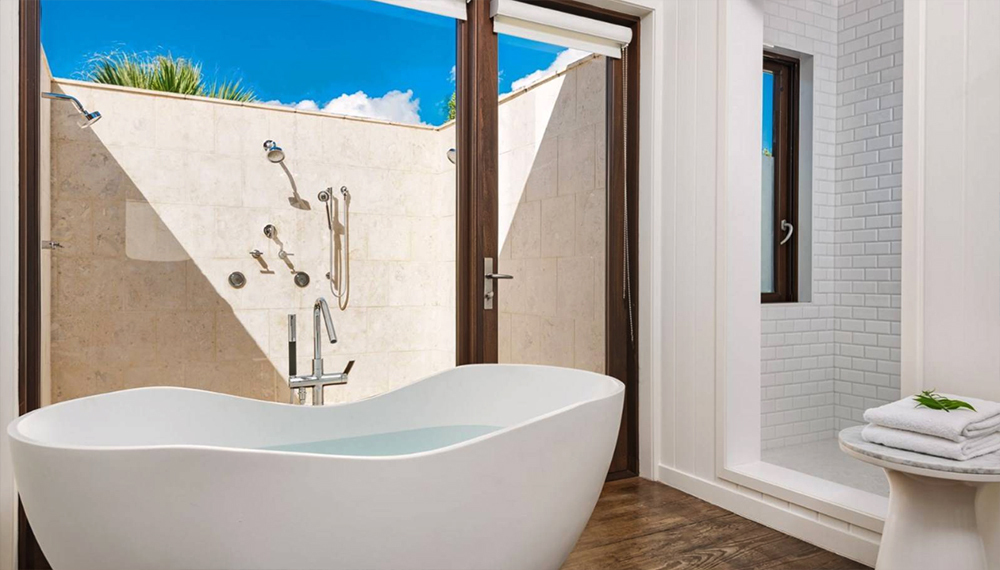La salle de bain principale, exclusive à la première chambre, possède une baignoire autoportante, une douche vitrée et une douche extérieure.